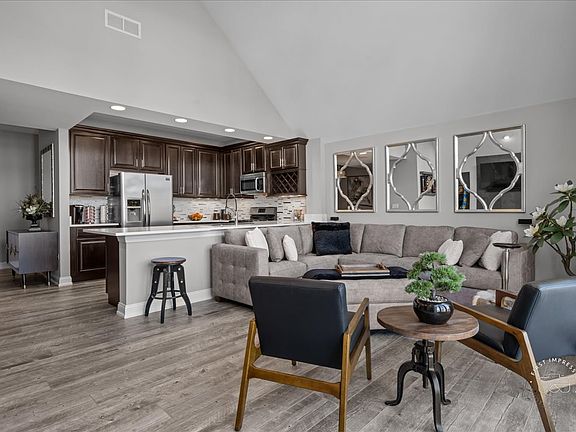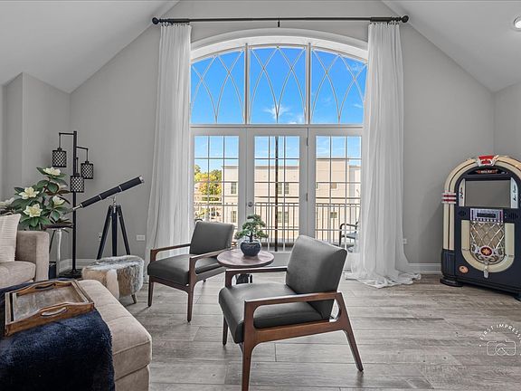 Coveted Milestone Row penthouse! Rarely available 2 bed, 2 bath condo fully updated in 2022, perfectly located in the heart of downtown St. Charles next to the new Whole Foods. This stunning top-floor home features soaring vaulted ceilings, oversized arched windows, wide-plank flooring, and a private balcony with treetop views. The open-concept layout showcases a modern kitchen with quartz countertops, stainless steel appliances, rich cabinetry, and a large island overlooking the spacious living room with fireplace. Designer lighting, underground garage parking, and unbeatable walkability to restaurants, shopping, and Fox River trails make this a truly exceptional find.
