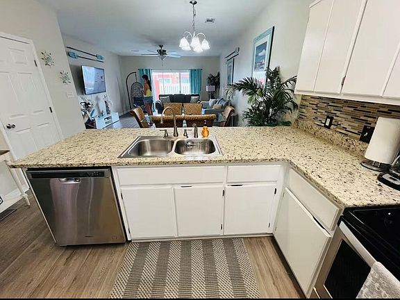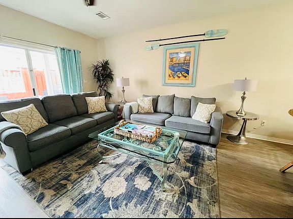 Move-in ready furnished and beautifully updated, this charming 2-story townhome is located just a 5-minute walk to the Boardwalk entrance and the beach. Fully remodeled in 2018, the home features wood-look LVP flooring throughout the first level, granite countertops, white shaker kitchen cabinets, new stainless steel appliances, fresh interior paint, updated fixtures, and new carpet upstairs.The first floor offers 9 ft. ceilings, an open kitchen-to-living room layout, abundant natural light, and sliding doors leading to a covered patio just steps from the community pool. Upstairs, you'll find two spacious master suites, each with a full bath, including one with a private balcony overlooking the pool.Major recent upgrades include a new metal roof (2024) and a new AC unit (2024). The one-car garage provides excellent storage and was remodeled in 2018 with tile flooring and its own AC unitperfect for a gym, game room, or hobby space. A pet-friendly privacy fence and a dedicated owner's closet add extra convenience.