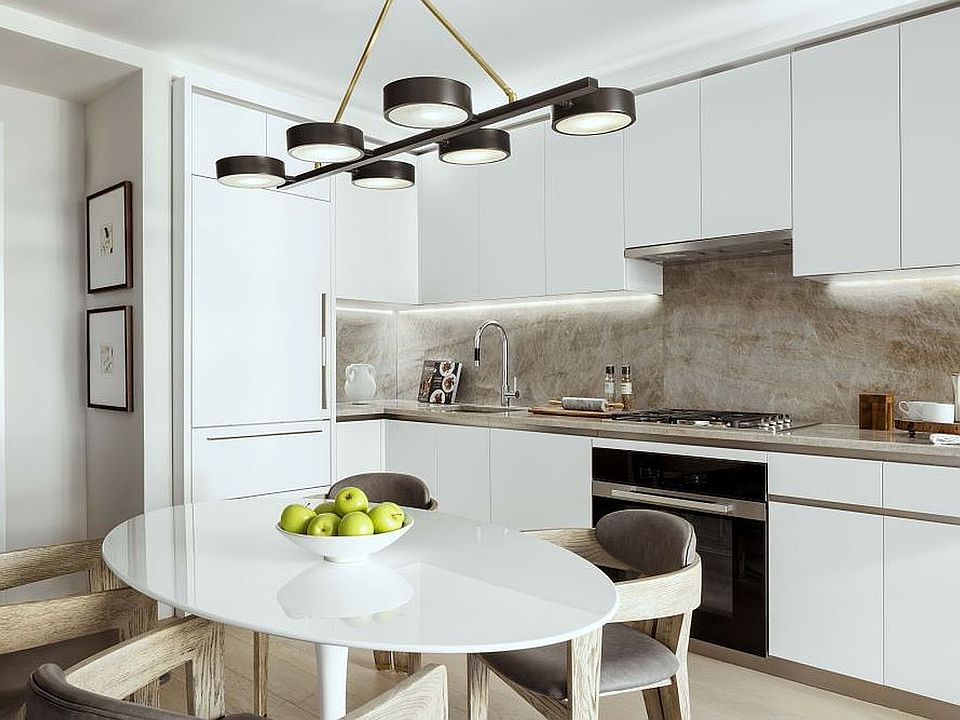 The meticulously-detailed interiors include myriad modern details including 7-inch-wide plank white oak flooring and massive bronze-finished windows with Caesarstone window ledges. Open-concept kitchens feature Miele appliances, natural warm-toned quartzite countertops, crisp matte white lacquer cabinetry, architectural cove lighting and Dornbracht faucet fixtures. Bathrooms are clad in handsome honey-toned European White Oak cabinetry, Calacatta Lincoln marble countertops with undermounted sinks, and showers with Dornbracht fixtures.