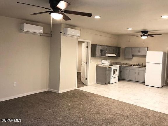 This property features 2 bedrooms, 3/4 bath, large family room and spacious kitchen which includes refrigerator, electric stove, microwave and stackable washer/dryer. Refrigerated air. Recessed lighting throughout. Ceiling fans. Within minutes to I-10, loop 375, shopping centers, schools and parks. Private parking rear of apartment.