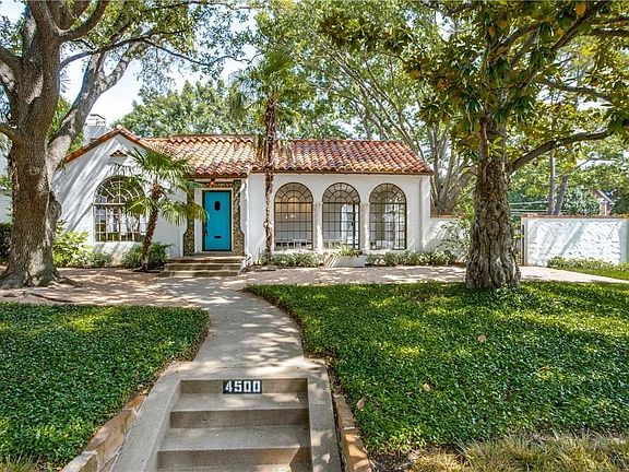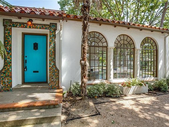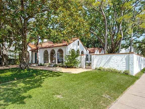 Iconic Spanish Colonial Revival style home designed by G. Mallory Collins in 1933. Situated on a prime corner lot in Bradfield Elem. This exquisite property has inimitable curb appeal with mature canopied trees, a terracotta tile roof, an intricate mosaic treatment framing the front door, stunning arched windows partitioned by cast acanthus leaf solomonic columns, and a trowel sweep finished wall that gives this Highland Park landmark home privacy that is architecturally aesthetic and functional. Detached quarters, 1 bed, 1 bath, perfect for family, guests, an art studio, or an office. The two-car garage has an attached carport that allows for four car tandem parking.
