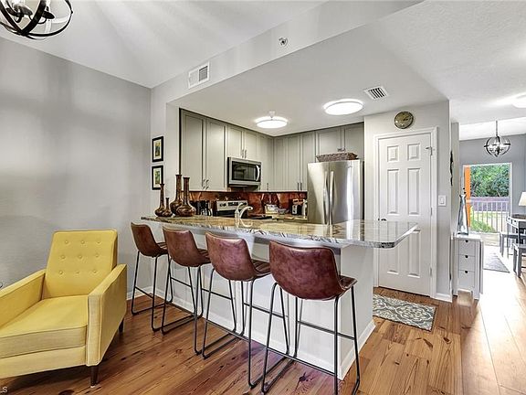 Located in the Bayshore Arts District, this turnkey-furnished home is surrounded by tranquil nature preserves and is positioned outside the flood zone for added peace of mind. It boasts high-end features such as granite countertops, hardwood floors, and new appliances. The open living space flows seamlessly to a lanai with beautiful preserve views. The versatile third bedroom includes a queen-size foldaway bed and blackout shades, offering both flexibility and convenience. Additional features include a carport, and garage is optional for additional fee. Just a short walk to the Botanical Gardens, pickleball courts, Celebration Park, and local restaurants, and only 3 miles to Olde Naples and the beach. This pet-friendly community offers fantastic amenities: a pool, sauna, clubhouse, fitness center, and barbecue area, providing an ideal environment for an active lifestyle. Don’t miss the chance to own this beautifully upgraded home in a prime location!