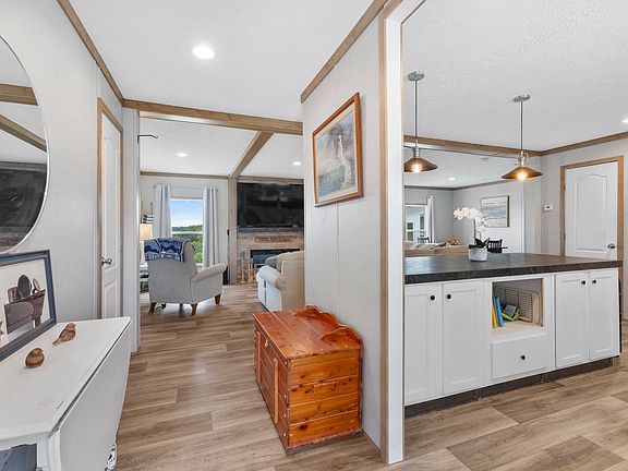Welcome to this beautifully designed 3-bedroom, 2-bath home that blends modern updates with warm, inviting charm. Inside, you’ll find gorgeous floors, striking faux wood beams, and a cozy fireplace feature that anchors the open-concept living space. The stunning farmhouse-style kitchen is a true showstopper, complete with a large island, black stainless appliances, a farmhouse sink, and a stylish backsplash, all flowing seamlessly into the formal dining area—perfect for hosting family or friends. The covered back porch offers a bright retreat with sweeping views, while the thoughtful layout ensures both comfort and functionality. Every detail, from the finishes to the flow, has been designed with care. All of this is situated on a picturesque ridgeline, providing beautiful views and a setting that feels like home the moment you arrive.