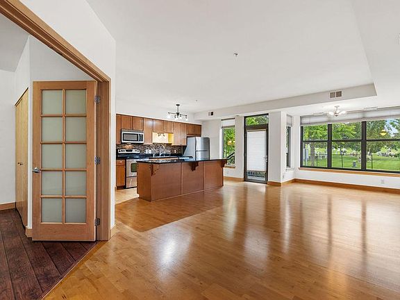 Walkable, urban living at Steele Flats, a modern building. Spacious two bedroom, one used as an office plus two baths. This condo lives like a townhome with a separate entrance for guests or taking the dog for a walk. There is also heated underground parking and an elevator to the unit. Open floor plan with gathering space a the large kitchen island. The large owner's suite had a walk-in closet and its own 3/4 bath. The second bedroom has French doors so can also be used as an office. The full hall bath has a tub and shower. Besides the underground parking stall #7, this unit has an assigned parking spot by the rear door to the building. Don't miss this home offering an easy life style with bike paths, the Creek and all the restaurants, bakery, coffee shops, and amenities of 48th and Chicago. Easy access to downtown and the airport.