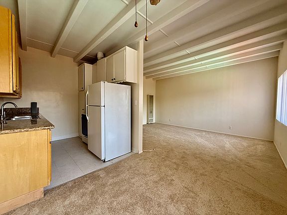 - Kitchen includes a fridge and stove