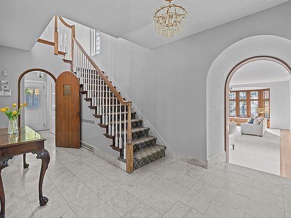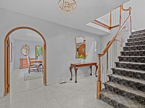 The home features a gracious center hall layout; a spacious living room with a wood-burning fireplace; formal dining room; renovated kitchen; luxuriously renovated bathrooms with floor-to-ceiling marble; and a den with a beamed ceiling. Arched doorways enhance the home’s old-world charm, with a bright and functional home office, in addition to the seven bedrooms, and a walk-in finished basement provide versatility for modern living.