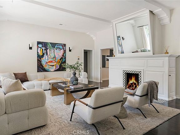 The property makes a striking first impression with its dual- gated entry motor court sprawling front yard, lush, mature landscaping, and resort-like grounds. Inside, timeless architectural charm meets contemporary updates—featuring high, beamed ceilings, wide-plank hardwood floors, and large windows that flood the space with natural light. The formal living room opens to a spacious family room with a custom stone fireplace and flows effortlessly out to the expansive deck, pool, and spa.