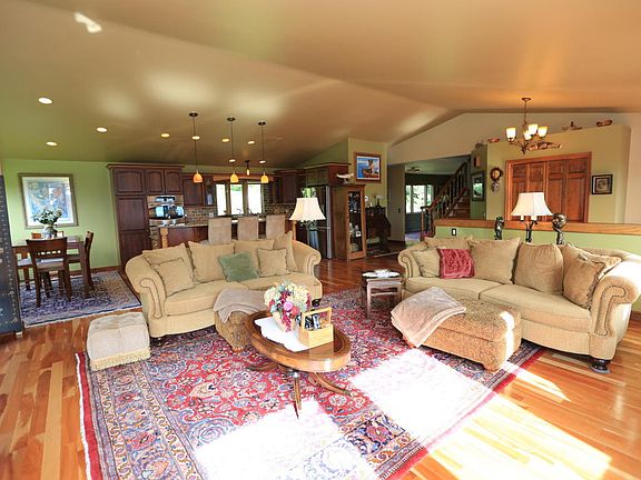 Enjoy sweeping views of Cook Inlet through lg bay windows; Entertain on your scenic stone & brick patio w/fire pit close to babbling brook; BBQ on front deck w/views; massive river rock FP, open floor plan, huge LR; family room leads to outside bk dk; luxurious master has bay window w/sweeping views, rm 4 king bed w/space to spare plus brand new en suite. California closets keep you organized.