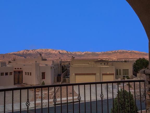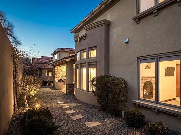 Timeless Mediterranean style architecture and beautiful quality finishes define this incredible custom home located in the securely gated community of Oxbow North. This incredible floor plan offers lots of versatility and would be ideal for multi-generational buyers with 2 primary suites, one upstairs and one on the ground floor. Designer finishes include a custom iron entry door, travertine stone flooring, hand troweled plaster wall finishes, handcrafted furniture grade cabinetry, rich granite, Wolf and Subzero appliances, beautiful wood windows with casing, and beautiful solid wood interior doors. The backyard offers a private retreat designed for low maintenance living. Beautiful views of the Sandia Mountains, the bosque, the river, and the city lights can be enjoyed from upstairs.