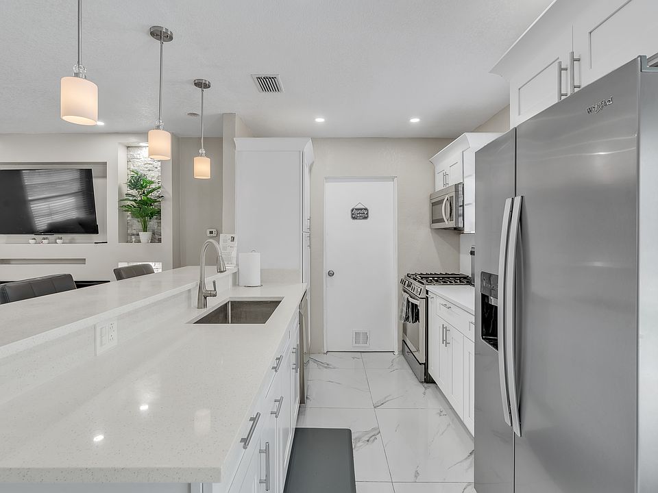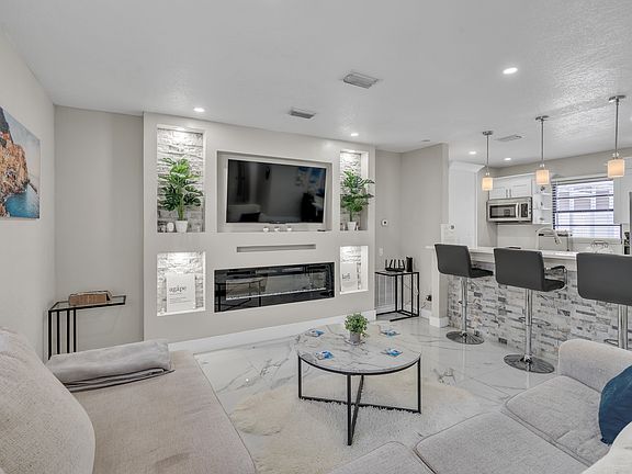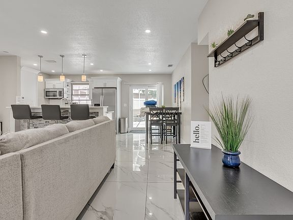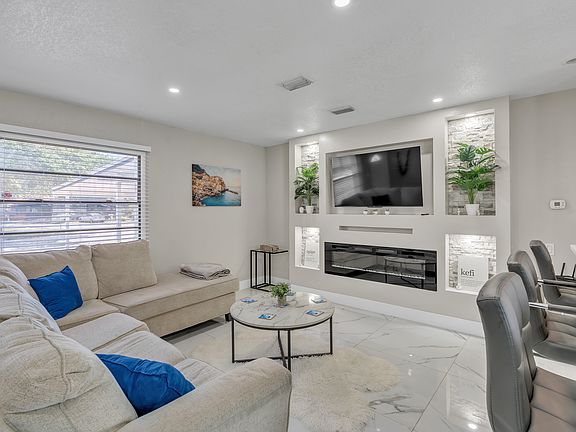 Discover this beautifully appointed 3-bedroom, 2-bathroom residence featuring a seamless, open-concept floor plan. The main living area integrates a spacious living room with a modern fireplace, a dining area, and a well-equipped kitchen boasting a central island. The home includes a dedicated laundry room for convenience. The master bedroom offers privacy and comfort with an en-suite bathroom. Outdoor living is enhanced by a private, screened-in deck and pool area, complete with space for outdoor seating and entertaining. The property also includes an expansive backyard and a two-car carport!