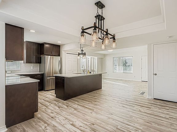 The kitchen has been fully transformed with modern cabinets, sleek countertops, a stylish backsplash, updated lighting, stainless steel appliances, and new flooring. Every detail is fresh and contemporary. The living and dining areas feature new flooring and lighting along with a cozy fireplace creating a warm and welcoming space. Large windows bring in natural light throughout the home.