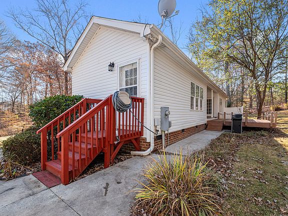 Escape the everyday and step into your dream home, a rare, one-level sanctuary perfectly nestled on a beautiful 1.5-acre lot, offering the ultimate in privacy as you are surrounded by hardwoods with a creek running across the property. Located on a quiet cul-de-sac in a lovely small rural neighborhood, you enjoy the perfect balance of serenity and convenience, being only 9 minutes from the heart of vibrant Saxapahaw and a quick 18-minute drive to Carrboro. You can unwind on the classic rocking chair front and back porches or host friends on the large deck, all while soaking up the peaceful natural surroundings. Inside, the spacious family room features a cozy corner fireplace, while a separate dining room is ready for gatherings, and all three bedrooms boast walk-in closets. The primary bedroom provides a spacious retreat that includes a unique bonus nursing/sitting room complete with built-in bookshelves, and the attached primary bath is offers a separate shower and a large soaking tub, alongside double vanities mirrored in the second bathroom. Practical perks include a dedicated separate 2-car garage with space for a workbench or storage, a paved parking pad, and plenty of parking for entertaining, all sitting under a new roof (late 2021).