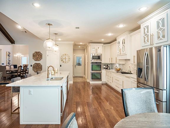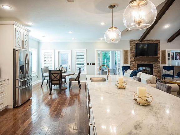 Inside you will find a spacious upstairs. The kitchen has recently been remodeled with marble countertops, gorgeous pendant lights, soft closed cabinets and many unique features for entertaining. This space allows for many guests and family members to gather around the marble countertop bar, breakfast and dining room tables. The homeowners recently added a new deck (700 sqft +/-), tongue and groove ceiling and outside ceiling fans for lounging and/or entertaining. Take that entertaining downstairs to the brand new indoor/outdoor dining and living space. This space has been enclosed (700 sqft+/-). Inside you will see a new grill, gas burner and a sink. Both vent hoods were made special for this area of cooking. A granite countertop and bar allows for a feast to be prepared and served. The screen/vinyl shades are remotely operated to create a pleasant evening regardless of the weather outside. A split mini and a LED fireplace (remote controlled) have been placed for pure comfort no matter the weather. The upstairs flooring is hardwood and tile. The ceilings are surrounded by crown molding. There are 2 bedrooms, 2 full bathrooms and a half bath located on main level. The living room shares a gas fireplace with the sunroom. The downstairs has 3 bedrooms, 2 full bathrooms, partial kitchen and a spacious unfinished room. Lots of spacious rooms for entertaining and relaxing. A new irrigation has been placed and new shingles 2019.This information deemed reliable but not verified or guaranteed.