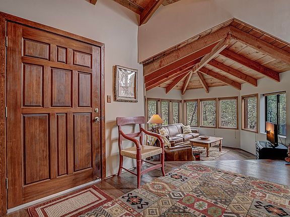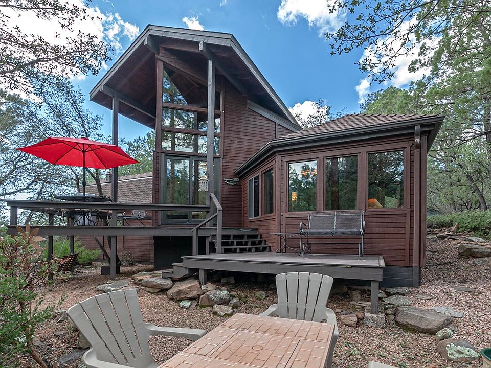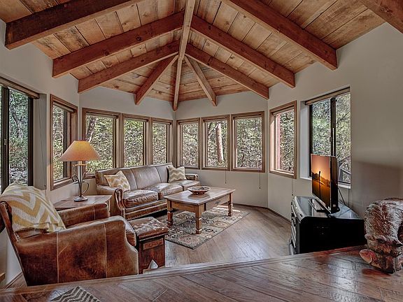 This cabin is in an amazing and serene location backing to common area, giving it the feeling of a private treehouse retreat. As soon as you step inside, large windows frame the beautiful views of trees and surrounding mountains, creating a true sense of privacy and connection to nature. The home features newer wood flooring throughout, soaring wood cathedral ceilings an updated bathroom and a bedroom and bath on the main level. The kitchen is nicely appointed and all the decking has been replaced with durable composite decking for easy maintenance. Upstairs, a second bedroom loft includes a private deck and offers plenty of space for extra guests. A newer heating system and HVAC provide comfort year round. The cabin comes completely furnished, with furniture and decor included (a list will be provided of items not conveying). A one car garage adds convenience and the newer roof reflects pride of ownership. This is truly a must-see property.