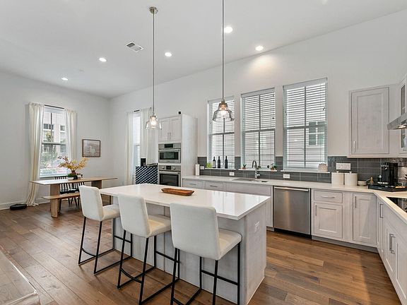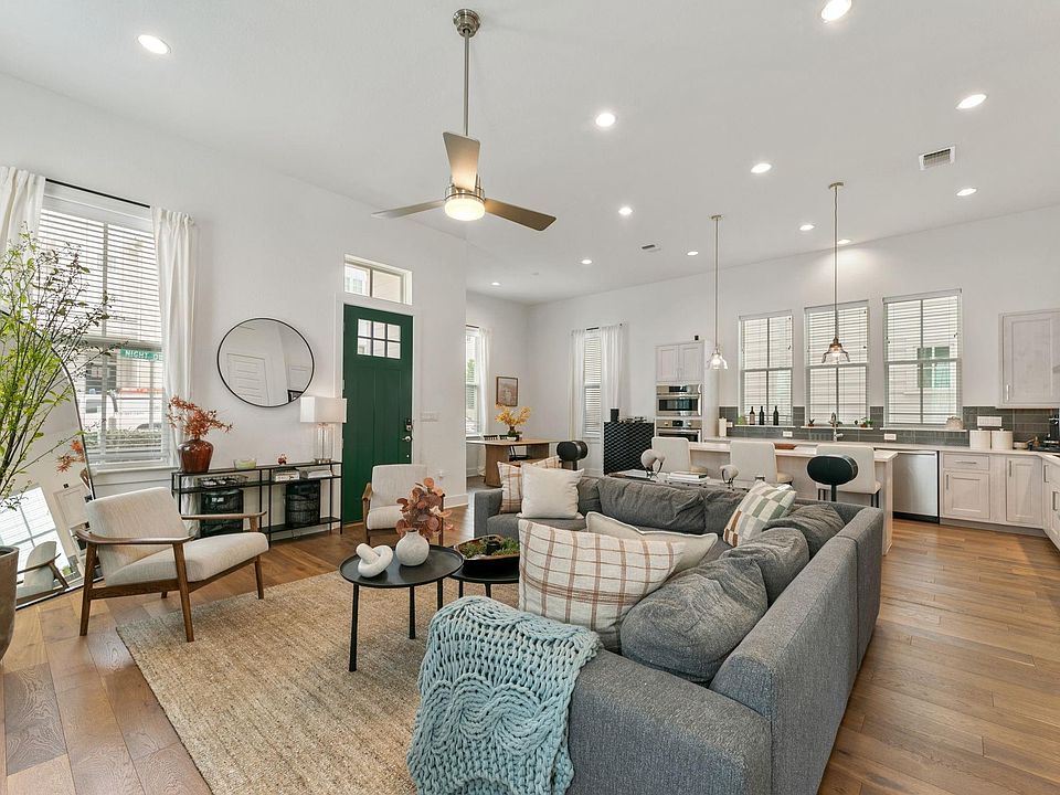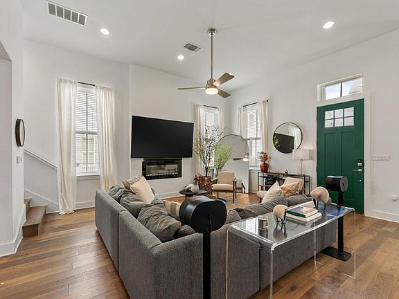 This beautifully designed home is an entertainer's dream, featuring an open floor plan and soaring 12-foot ceilings that create an inviting atmosphere. Enjoy the warmth of hardwood floors throughout, and whip up culinary delights in the gourmet eat-in kitchen, complete with Bosch stainless steel appliances. Upstairs, you'll find a luxurious owner's suite, offering a serene retreat with a soaking tub, walk-in shower, and private balcony. Two additional spacious bedrooms provide ample space for family or guests. Eco-friendly features abound, including a durable metal roof, a 24-volt electric car charger-capable outlet, and xeriscaped landscaping maintained by the HOA, ensuring low maintenance and sustainability. The vibrant Springdale Creek community boasts a private dog park and is just a stone's throw from Mueller, offering easy access to shopping, dining, and the popular Sunday Farmer's Market. With a nearby golf course, YMCA, and trailhead for the Little Walnut Creek Hike & Bike Trail, outdoor enthusiasts will love the location. Centrally located, you're just a quick ride to downtown, the University of Texas, and the Domain. Plus, public bike lanes provide a seamless route into town. With dog-friendly neighbors and a welcoming atmosphere, this home is perfect for relaxation and recreation!
