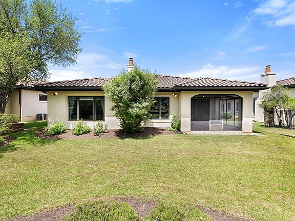 Situated within the sought-after Verde Trails enclave of the esteemed Spanish Oaks community, this lock-and-leave residence blends sophisticated elegance with the ease of low-maintenance living. The “Live Oak” floor plan is one of the architectural highlights of this limited collection—offering striking design, spacious interiors, and a strong connection to the natural surroundings. Encompassing 2,592 square feet, this home includes three spacious bedrooms and three well-appointed bathrooms. A gracious foyer leads to the grand living room, where a charming fireplace and rich hardwood floors create a warm, inviting atmosphere. The formal dining room is framed by large picture windows on both sides, delivering a dramatic experience that showcases the surrounding greenery. The kitchen is centered around an impressive island—ideal for both culinary pursuits and casual gatherings. Knotty alder cabinetry adds character and function, providing ample storage while complementing the overall design. Flowing effortlessly into the living room and the screened-in back porch, the space is tailored for everyday comfort and seamless entertaining. Outdoors, the architecture and landscaping of the home take center stage. An inviting courtyard surrounds an elevated patio set amidst luscious native landscaping, offering privacy and serenity. The screened-in back porch overlooks a peaceful greenbelt, creating a perfect setting for morning coffee or evening relaxation. Strategically positioned near the eastern entrance of Spanish Oaks, Verde Trails is an exclusive community of only 20 unique luxury garden homes. Residents enjoy unmatched access to Spanish Oaks’ premier amenities, including one of Texas’ top private golf clubs, a resort-style Pool Pavilion with summertime café, pickleball and beach volleyball courts, miles of hike and bike trails, community parks, 24/7 manned gate security, and access to award-winning Lake Travis ISD schools.