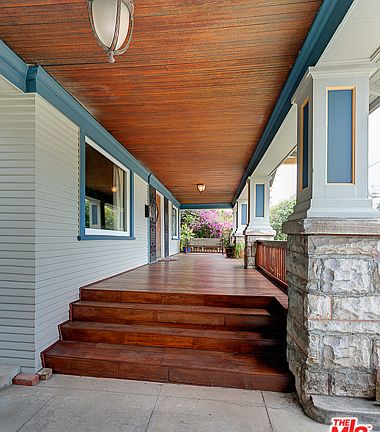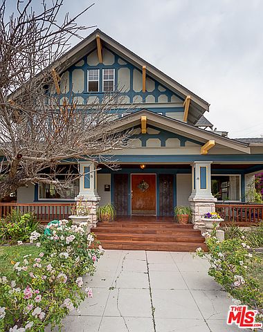 Built in 1913 on a prominent corner adjacent to Lafayette Square, this arts and crafts home is a sight to behold. Period details throughout the home blend seamlessly with many updates to create a blend of charm and modern comfort. A large porch covered in Mahogany hardwood welcomes you into this majestic home. Inside, the foyer leads into a parlor and living room with fireplace, as well as a formal dining room. Modern eat in kitchen with granite island opens onto the adjacent family room. An office and 3/4 bath round out the first floor of the home. Upstairs includes a master suite with views to the Hollywood sign, full bath, walk-in closet and sitting area. There are 3 more bedrooms, a full bath bath,laundry room and library/5th bedroom. Third floor is a finished space offering an additional 700 sq ft. Out back is a 3 car finished garage and room for pool. Home has many updates including many windows, central air, plumbing and electrical. Come take a look, you will fall in love.