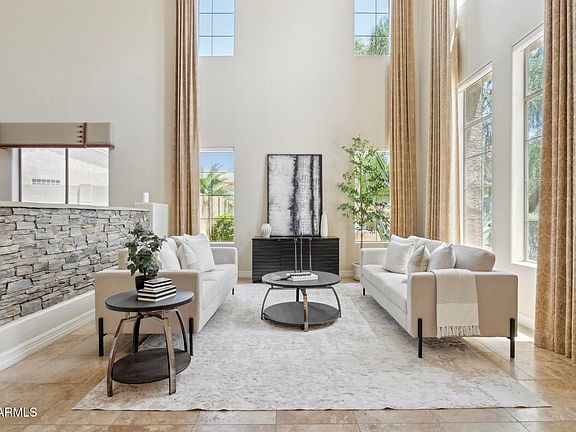 The backyard is a true showstopper, featuring a resort-style pool and above-ground spa, a full Ramada-covered bar, built-in outdoor kitchen/grill center, putting green, gas fire pit, and spacious side yards—all framed by a view fence with mountain views! & more to see! and MORE! To top it all off, enjoy serene mountain views, privacy, and peacefulness as the home backs to a desert belt with a view fence. In close proximity to community park, golf courses, shopping, dining, and more!