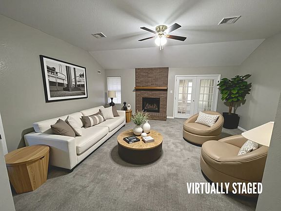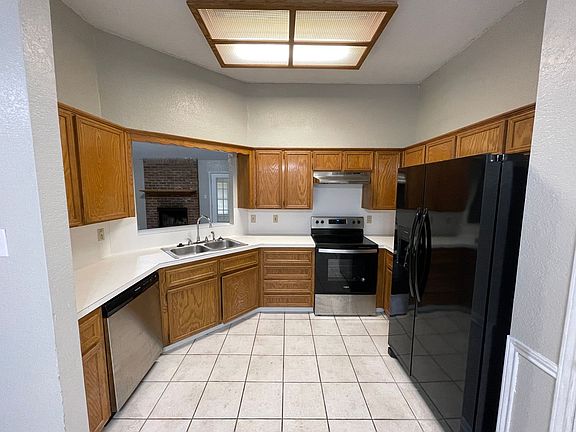 4-bedroom 2-bath house with carpet in the living room and bedrooms, and tile flooring in the kitchen and bathrooms. The kitchen features black appliances, and the bathrooms include unique colored tile for added style. The master bedroom offers a walk-in closet, and a bonus day room provides flexible space for relaxing or working. The home includes washer and dryer connections and is equipped with solar panels for energy efficiency. Outside, enjoy a covered porch, spacious backyard, and a shed for extra storage. An attached garage adds to the convenience. Come by our office to see this property today.