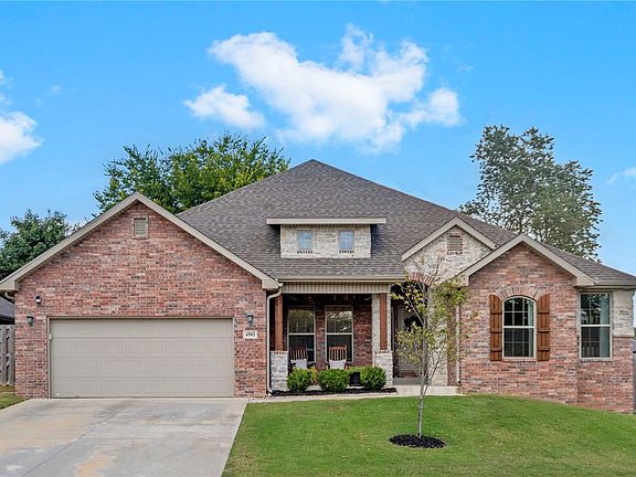 Welcome to this stunning, all-brick 4-bed, 3-bath home in sought-after Willowbrook Farms, where charm and convenience meet. Neighborhood perks include 14+ acres of greenspace, pool, and dog park. Conveniently located just minutes from Downtown Bentonville, Pinnacle shopping area, and the Airport. With over 2,600sqft, this bright and airy home offers a split floor plan with a spacious living area, tall ceilings, wood-look tile, and a cozy brick fireplace. The chef’s kitchen boasts a large island, quartz counters, gas cooktop, under-cabinet lighting, walk-in pantry, and abundant storage. The formal dining room or office adds flexibility for work or entertaining. Retreat to the owner’s suite with dual vanities, soaking tub, and two walk-in closets—one with direct laundry access. Another bedroom features its own ensuite bath, perfect for guests. Outside, enjoy the oversized fenced yard, extended patio, and covered porch- ideal for entertaining. Bonus: shed, blinds, refrigerator, washer/dryer convey. Playset negotiable.