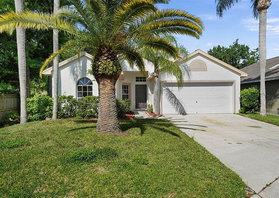 Excellent Villarosa VALUE!!! She’s a peach! (Or a plum :)) With all new paint, interior and exterior and a newer roof and HVAC (both in 2020), nestled in lovely cul-de-sac with a great fenced in backyard, this 3 bedroom, 2 bath, split floor plan is a great buy! Light and bright with vaulted ceilings, home feels very spacious and the fabulous flex space is great for home office or play room. Newer or new appliances - refrigerator (2020) and stove, dishwasher, microwave, and washer all new in 2024! Located in the very pretty neighborhood of Villarosa - offering lots of sidewalks amongst more natural landscaping and common grounds and districted to highly regarded schools of McKitrick, Martinez and Steinbrenner. Vaulted ceilings and new LVP flooring throughout home creates a space full of light and clean, crisp lines - easy to move right in. Neighborhood is a hop, skip and a jump from the Veteran’s Expressway so easy commute weather heading to downtown Tampa for work or play!