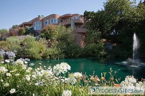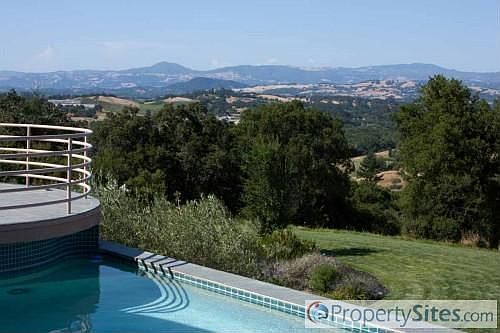 This stunning gated contemporary estate beautifully frames sweeping panoramic Sonoma Wine Country views and is in the desirable Russian River Appellation. Enter through double custom copper doors to walls of glass overlooking vineyards. French doors lead to the terrace and lap pool. Lush gardens surround the stocked pond with dock, sprawling lawn and gardens. Privacy abounds as you enter through the gate into your own 26 acre oasis.