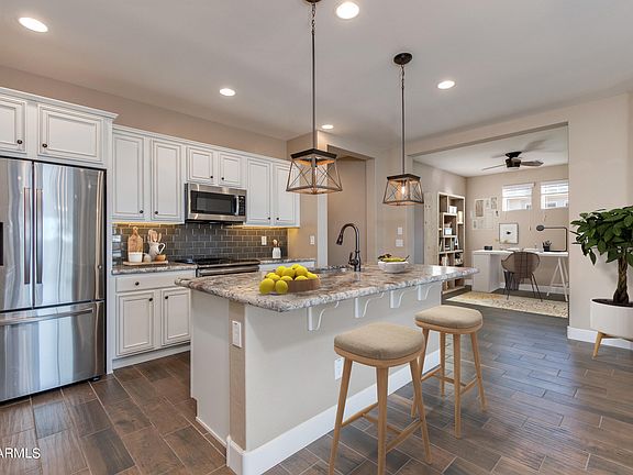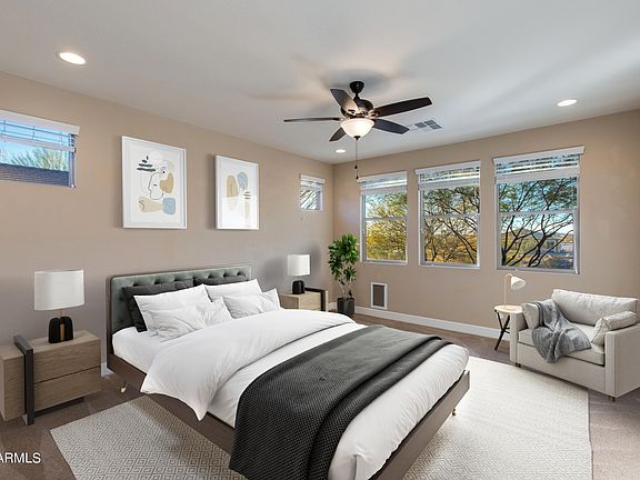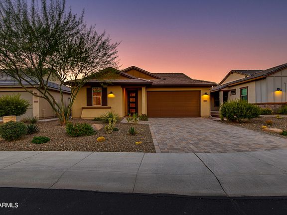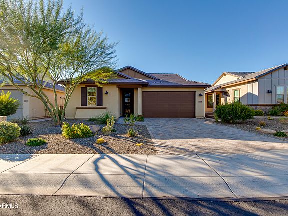 Enjoy the Privacy of 2 Primary Suites. Live the good life with a owned Solar System that will have you enjoying APS energy credits throughout the year. Nestled in the Pinto Neighborhood this home features HOA managed landscape & private cul-da-sac location. Your motorized patio shades will provide privacy screening while enjoying the gorgeous sunset colors every night. Upgraded flooring, cabinets, light fixtures throughout with an AMAZING number of cabinet pull outs designed into your kitchen. Home includes custom window covers with additional screening at 12ft sliding wall of glass. Garage includes ample custom cabinet storage, work space & owned RO system.