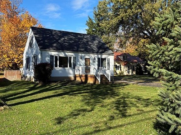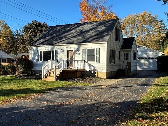 Amazing Cape with oversized, heated garage (shop) with sink - on extra deep lot. House has been recently painted, new luxury vinyl plank thru most of first floor. Cherry kitchen with Corian countertops and ceramic tile floor. Upstairs has three bedrooms (smallest room with pocket door, does not have closet). Walk-in closet across hall. New carpet thru entire 2nd floor and stairs. Basement has finished rooms as well as full jacuzzi bath. Very large two-tier deck partially covered, accessible from sliding door in living room. Wooded rear lot over 350 feet deep with shed.