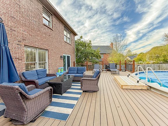 Wood privacy fenceImpressively charming brick homeLarge back deckPatio and firepit areaLovely backyard