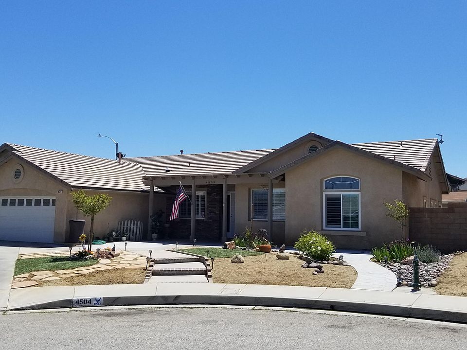This immaculate 4BR, 3BA, 3 car garage, Harris built home is located on the end lot of a Cul-De-Sac, in an Exclusive and Peaceful West Palmdale family neighborhood. The original family lives in this home and their pride and care is evident, in fact they recently upgraded and remodeled the home inside and out with the following; Hardwood Floors in the Family room, Entry, hallway and 4th BR, Built in Cabinet in Dining room and a 2 door slider in Family room, New paint and windows and shutters, newly ''NHanced'' Kitchen cabinets, custom brick flooring in Kitchen and laundry room, new water heater and new landscaping front and back with block walls. There is a huge, 15 by 70 foot paved RV access, a length of the house covered patio cover and an above ground pool with decking and 2 custom 12 by 16 foot sheds/ studio.Save $$ on Electricity, the Solar panels are owned, no Lease or payments! They also have a Rain Soft water Softener and a 2nd utility sink in the garage with built in cabinets