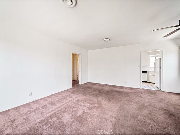 Inside, the home features a light-filled living room with three large street-facing windows that fill the space with natural light. Carpet flooring flows throughout most of the home, while the kitchen and bathroom feature classic tile floors. The kitchen offers tiled countertops, a built-in laundry area, and direct access to the spacious backyard—perfect for everyday convenience.