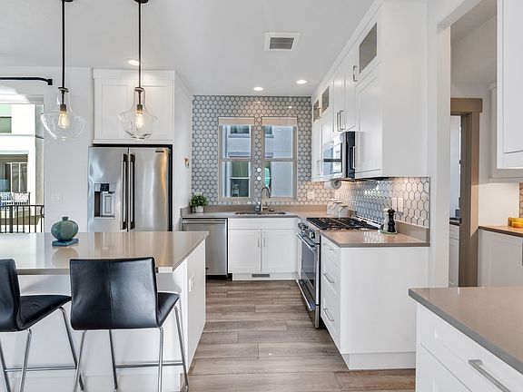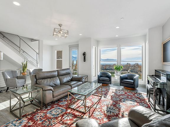 Experience elevated living with unobstructed views of the entire Salt Lake Valley from this exceptional Daybreak townhome. Thoughtfully upgraded and freshly updated, this home offers modern comfort paired with rare outdoor living spaces-including a fenced yard, a welcoming covered front porch, two private balconies, and a stunning rooftop terrace with utilities already in place for grilling or a rooftop garden. All outdoor areas feature brand-new Duradek decking backed by a 15-year warranty. Natural light pours throughout the home thanks to floor-to-ceiling windows and several bay windows that capture views on every level. The interior has been recently repainted in a fresh, modern color scheme and includes new carpet and new luxury vinyl flooring on the main level. The fully remodeled kitchen features professional-series appliances, two ample pantries, and beautifully updated finishes that make it a true culinary centerpiece. The living room is equally impressive with a sleek Samsung Smart TV that doubles as a piece of art. Thoughtfully designed for flexibility, the home includes a main-floor office or additional bedroom with radiant floor heating, as well as a spacious fourth-floor flex room perfect for a studio, fitness space, or entertainment lounge. The primary suite showcases breathtaking views, a large walk-in closet with extensive storage options, and an ensuite bath with a Euro-glass shower featuring dual shower heads and a double vanity. The laundry room provides added convenience with extra storage and an included set of Smart LG washer and dryer. Additional upgrades throughout the home include a Nest doorbell, a central vacuum system, a smart garage door opener with a built-in camera, and a full water softener system. Surrounded by Daybreak's lakes, trails, parks, and community amenities, this home offers unmatched style, comfort, and lifestyle in one of the community's most desirable locations. Homes with these views and this level of finish rarely come available-schedule your showing today and experience elevated Daybreak living at its finest.
