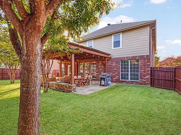 This stunning two-story brick home, ideally located in the highly sought-after Craig Ranch community, exudes timeless curb appeal with its elegant façade and spacious front three-car garage. Step inside to discover a bright, open interior filled with natural light, rich hardwood floors, and sophisticated designer finishes throughout. The grand living room features a custom built-in entertainment center and flows seamlessly into the chef’s kitchen, showcasing painted cabinetry, a wrap-around island, gas cooktop, and custom pantry. The adjoining breakfast nook, framed by charming bay windows, offers the perfect spot to enjoy your morning coffee. A private study enclosed by French doors provides an ideal work-from-home retreat, while the full-size utility room offers contemporary updates and functionality. A first-floor guest suite ensures comfort and privacy for visitors. Upstairs, enjoy a spacious game room, perfect for media nights or a pool table, and a serene primary suite that serves as a true escape, complete with dual vanities, a jetted tub, separate shower, and custom walk-in closet. Two additional bedrooms and a versatile bonus room, ideal as a fifth bedroom, playroom, home gym, or flex space, round out the second level. Step outside to your private backyard oasis featuring a pergola-covered patio, and lush, fenced yard, perfect for entertaining or relaxing under the stars. With its open-concept design, thoughtful upgrades, and unbeatable location near premier shopping, dining, and parks, this Craig Ranch beauty blends luxury, comfort, and convenience in one of McKinney’s most desirable neighborhoods.