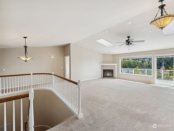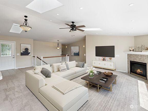 Beautiful southern views of Burrows Bay from this spacious daylight basement home. Enter through either the lower or main level and be welcomed by an open floor plan with vaulted ceilings and a cozy fireplace. A wall of windows perfectly frames the stunning sunsets. The expansive kitchen, complete with an adjoining butlers pantry is ideal for entertaining. The main level boasts a luxurious primary suite with a private bath, plus two additional bedrooms. This home is super light & bright! The lower level offers a large family room with fireplace, an extra bedroom, office and a 3/4 bath perfect for additional guests or additional living space. Large deck plus private back yard. 3 car garage plus ample parking for cars and RV/boat.