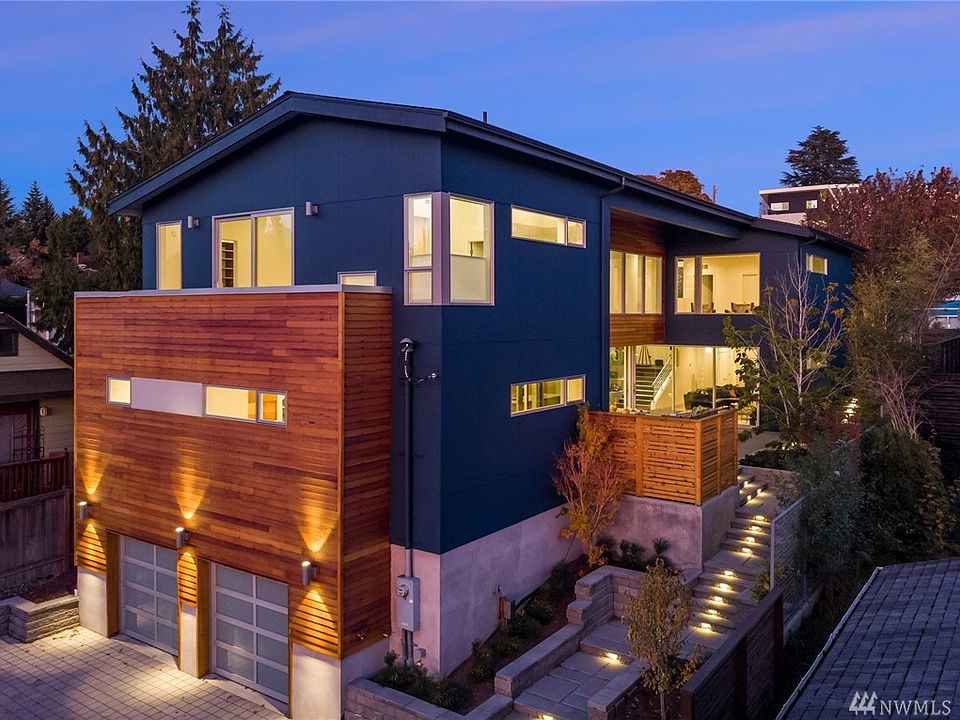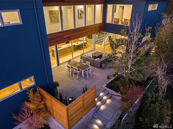 Remoderned Homes proudly presents COURTYARD a BuiltGreen modernist dwelling of 4100 SF filled w/natural light, sunsets & water view 2 blocks west of "Junction" shops & eateries. Sliding glass walls open to a beautiful landscaped custom hardscaped covered patio for indoor-outdoor living & entertaining all year. Exceptional chef's kitchen w/Teak cabinets, Quartz & pro appliances. Gorgeous master suite. Wide-plank white oak flrs. Sprinklers, A/C, 2-car garage plus. Mins to DT, Alki Beach & ferries.