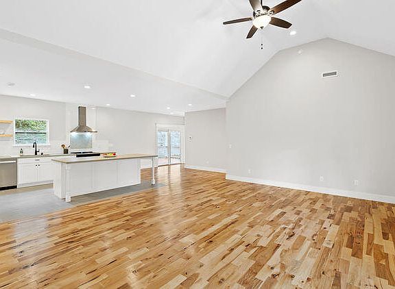 The gorgeous kitchen features custom cabinets, concrete countertops, a quartz sink, stainless appliances, and an oversized island—perfect for entertaining. A spacious living room flows seamlessly into the kitchen and dining area, while a separate pantry and laundry room add everyday convenience.