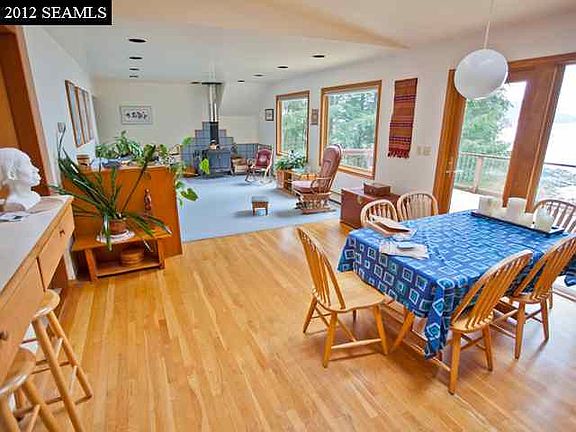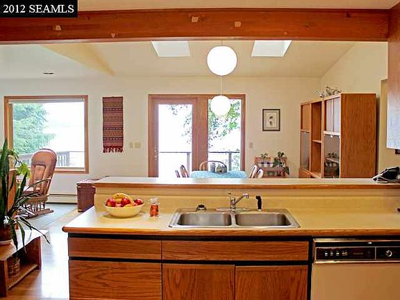 Skylights and large picture windows bring in the beautiful ocean front views and abounding natural light. Find a spacious den on the top level complete with a lofted reading nook and extensive custom built shelving and cabinetry. The third story master suite features tall ceilings and a view. Two bedrooms are located on the main floor along with a bonus room, currently set up as an art space with a sink and countertop. The downstairs apartment is a great space for guest or to operate as a rental.