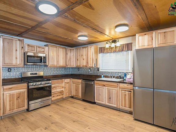 Discover classic Alaska comfort in this charming 1-bedroom, 1-bath home on a spacious lot in Fairbanks. Warm rustic character meets practical modern updates, starting with a generous kitchen featuring hickory cabinetry, stainless steel appliances, and plenty of counter space for everyday cooking or weekend gatherings. The open living area is anchored by rich wood accents and a cozy wood stove that keeps the home warm all winter long. Outside, you’ll find a covered entry, multiple storage buildings, dry cabin and a wide, usable yard—perfect for parking, projects, pets, or simply enjoying the outdoor space. Whether you're a first-time buyer or looking for an easy-to-maintain Alaska retreat, this home offers comfort, functionality, and room to make it your own.