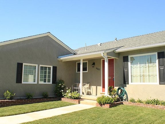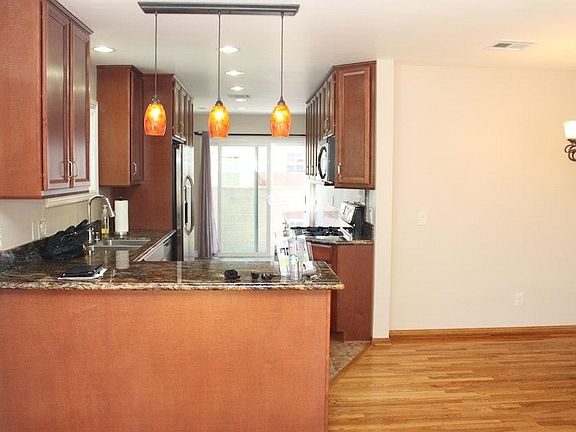 Beautiful single family home with original hardwood floors recessed lighting dual pane windows. Kitchen features brazilian granite oak cabinets stainless steel appliances pendant and recessed lighting. The bathroom is spacious and has a separate bathing tub and stand alone shower. The kitchen opens onto a paved patio that leads to a large well manicured backyard with rose bushes. Both front and backyard have sprinklers and gardener is included with rent. Garage with auto opener additional parking in driveway. Washer and gas dryer hook-ups are located in the garage. Located walking distance to shopping and restaurants. Short drive to freeways. No Smoking. No pets. Tenant is responsible for all utilities: water, trash, electricity and gas. Owner pays for gardener.