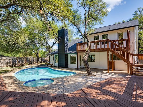 Nestled on a spacious corner lot in the coveted Westcreek neighborhood, this recently remodeled 4 bed, 2.5 bath home offers the perfect blend of modern updates and classic Austin charm. Located just minutes from Whole Foods, Costco, Alamo Drafthouse, and countless shopping and dining options, with Downtown only 10 minutes away, it delivers on both lifestyle and convenience. Inside, the thoughtfully designed layout features soaring ceilings in the main living area, an open-concept flow, recently installed wood floors throughout, and abundant natural light. The fully remodeled kitchen boasts updated stainless steel appliances, quartz countertops, updated cabinets & hardware, and a breakfast bar that opens into the dining and living spaces. Three secondary bedrooms and an updated full and half bath are located on the main level, while the expansive primary suite offers a private retreat upstairs with an ensuite bath with a double vanity and a walk-in shower, and a serene balcony overlooking the backyard. Step into the backyard to an outdoor oasis perfect for everyday living and entertaining with a sparkling pool and spa combo, extended pool deck, patio with twinkle lights, and lush landscaping.