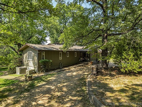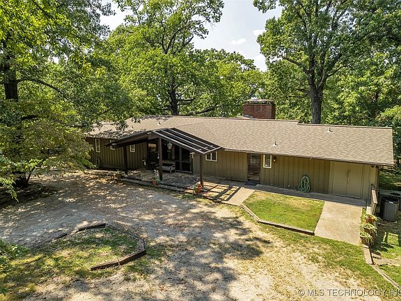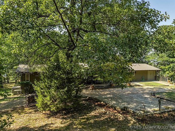 This does not happen often! You can enjoy your very own private point on Grand Lake in Disney that includes 7 plus acres, a gentle slope to your 3-slip boat dock in a deep water protected cove. This unique ranch style home was built in 1977 in a mid-century modern style with bold colors, clean lines, and an open floor plan that includes 4 bedrooms, 5 bathrooms, a large open living space, two fireplaces, a game room with a wet bar, a safe room, and an elevated back porch overlooking the lake. A few special features include bricks from the old St. John Hospital in Tulsa used to build the fireplace and patio walls, mature trees for lots of shade and privacy, a