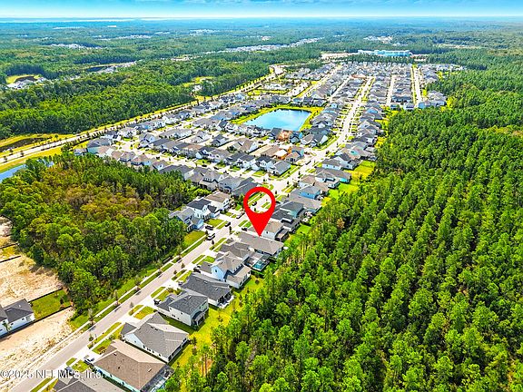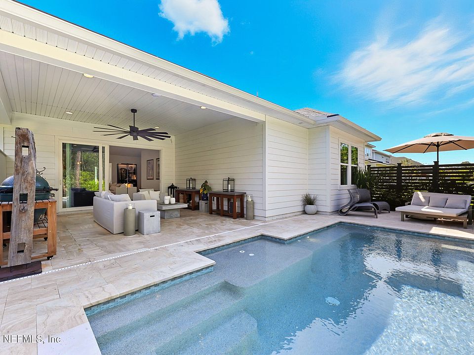 This meticulously maintained Riverside Homes Pool home sits on a preserve homesite in Seabrook Village, one of Nocatee's most desirable communities. Luxury finishes abound, including an upgraded chef's kitchen with premium appliances, custom island cabinets, quartz countertops, and designer pendants. RevWood flooring flows throughout living areas and bedrooms, with tile in baths and laundry. The gathering room boasts surround sound speakers, plus two ceiling speakers in the primary suite. Whole-home wiring for Wi-Fi extenders—including one on the lanai—ensures seamless connectivity. Step outside to your private travertine pool deck with heated & cooled saltwater pool, and lush landscaping Enjoy golf cart rides to Nocatee Town Center, dining, shopping, and award-winning amenities: waterparks, pools, pickleball, tennis, fitness, trails, and year-round events. Custom Builders Home Extensive Upgrades and Detailing