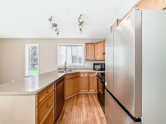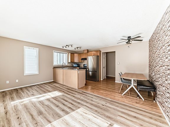 Welcome to Canon Ridge! This 2-bedroom END UNIT townhouse boasts new vinyl plank flooring throughout, yes, even upstairs! Enjoy a bright, open kitchen with maple cabinets, breakfast bar, and separate dining area. Sliding doors lead to your sundeck and picturesque backyard. Main floor features a 2-piece bathroom. Upstairs, find two large bedrooms, one with a private ensuite, plus a second full bathroom. The partially finished basement includes laundry and extra storage. An attached single garage and a well-maintained property complete the package. Close to schools, playgrounds, shopping, and public transportation. Water/Sewer and garbage included in condo fee!