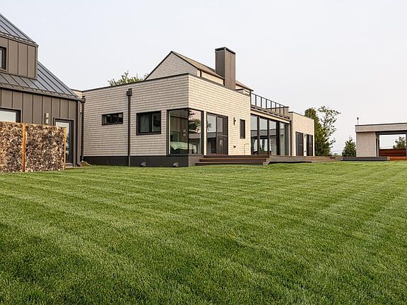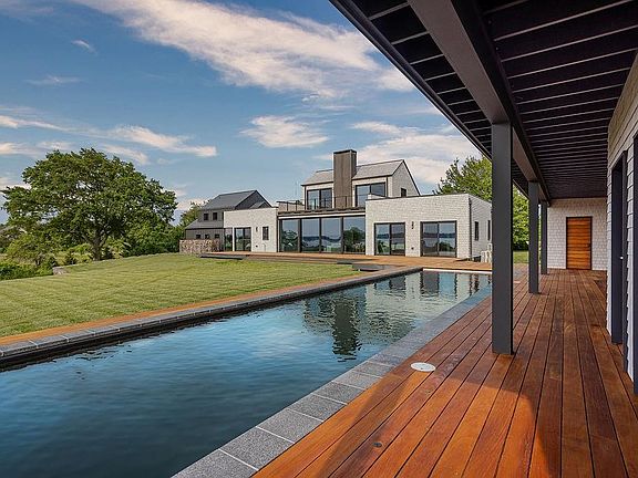 Discover the ultimate in contemporary living with this exceptional waterfront estate on 3.73 private acres along the scenic Sakonnet River. Thoughtfully designed to blend modern sophistication with serene natural beauty, this home offers the perfect balance of style, comfort, and privacy. The expansive main level is ideal for both daily living and entertaining. At its heart is a state-of-the-art kitchen with a Neolith porcelain island, custom cabinetry, and top-tier appliances. The dining area, anchored by a sleek Spartherm fireplace, overlooks a dramatic 32'x10' glass wall that brings the outdoors in. Also on the main level are a luxurious primary suite, two guest bedrooms with a shared full bath, and a spacious laundry room. Upstairs, a flexible living area opens to a deck showcasing panoramic 180-degree water views. A separate apartment with its own kitchenette and laundry offers privacy and comfort for guests or extended family. Outdoor living is just as impressive, with a 12'x52' heated pool, a pool cabana featuring a studio and full bath, and a convenient storage locker beneath the deck. Sustainable features include a 22kW solar array and two electric vehicle chargers. Boating enthusiasts will appreciate two deep-water moorings and a 200-foot jetty. Ideally located just minutes from Four Corners, with easy access to charming shops and Groundswell Café. This rare waterfront retreat is a haven of modern luxury, where thoughtful design meets coastal tranquility.