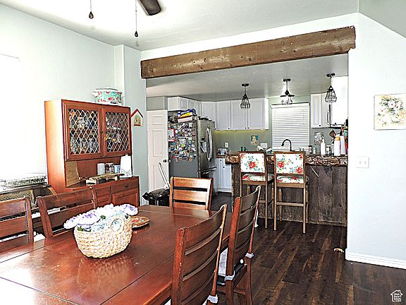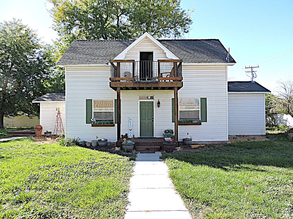 Timeless Beauty with charm throughout, this home offers both comfort and functionality. The quaint living room flows into the dining area and kitchen, providing an ideal layout for family living and entertaining. The main level features the primary bedroom with a walk-in closet, as well as a conveniently located bathroom and laundry room. The upper level includes two additional bedrooms, a full bathroom, and access to a balcony. The large, fenced yard offers ample shade and a patio area perfect for outdoor enjoyment and entertaining. Square footage figures are provided as a courtesy estimate only.