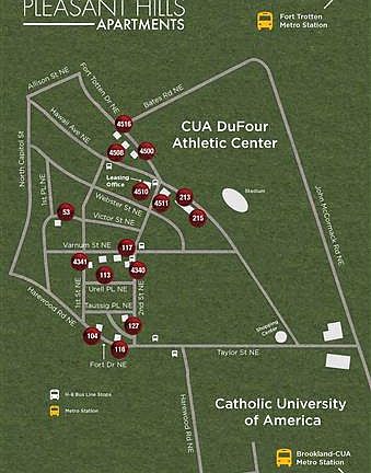 Live conveniently between Fort Totten and Brookland at Pleasant Hills Apartments in Northeast DC! Pleasant Hills is perfectly situated next to the Brookland/CUA Metro Station and Catholic University and offers bright, spacious one- and two-bedroom floorplans. At Pleasant Hills, you'll be just a short distance from Providence Hospital and the Washington Hospital Center with easy access to Downtown Silver Spring, Capitol Hill and all of downtown DC's retail and dining. Come to Pleasant Hills and experience convenient, affordable living in DC!