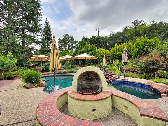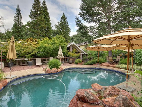 This gorgeous home takes in all of nature's extraordinary beauty sitting on a private magical nature wonderland w/a year round creek, sparking pool & separate pool house. The Chef's Delight kitchen has a Wolf Range, stainless steel appliances, Sub-Zero refrigerator, granite countertops, elegant backsplash, Gutsa cabinetry, pendant lighting. The home has vaulted ceilings, dramatic windows & beautiful art glass. Spacious master suite w/fireplace, sitting rm. Walk in wine cellar & 3 car garage.