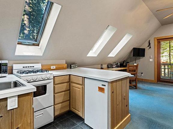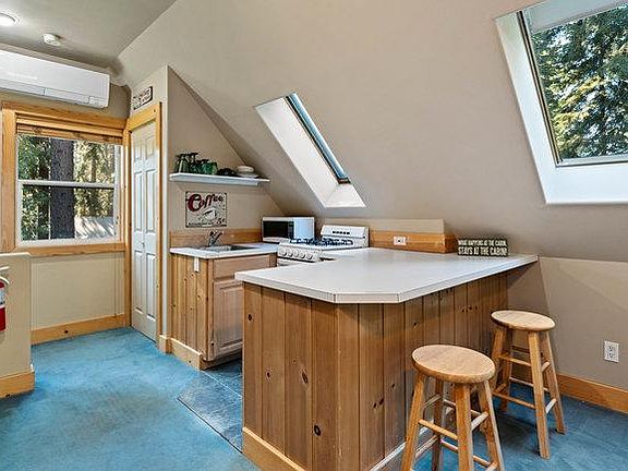 Welcome to your quaint studio nestled in Carnelian Bay! Situated between Kings Beach and Tahoe City, you are in the heart of ski country and have access to the Lake! This fully furnished, carpeted studio, perched above the garage, offers a cozy retreat with a separate entrance and exclusive access to a convenient storage shed (with a BBQ). Featuring a comfortable queen-size bed, an island for eating and work, this studio provides both comfort and functionality. The kitchen, complete with a gas stove and under-counter refrigerator, is fully functional while the bathroom boasts natural light. There is a built in storage unit and pantry for storage. The unit has a mini-split unit for heating and air conditioning to ensure comfort in any season, and sky lights for lovely natural light throughout. For ambiance (and additional heating) there is an electric 'fire place' and for internet you'll share our fast wifi.