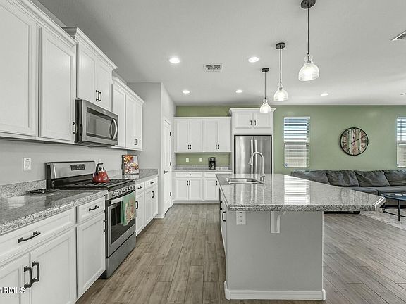 Step inside to a spacious great room layout, highlighted by triple glass sliding doors that flood the space with natural light and seamlessly connect indoor and outdoor living. The gourmet kitchen is a chef's dream with granite countertops, a large island, upgraded cabinets with elegant crown molding, and a gas stove. Stylish wood-look tile floors are perfectly placed throughout high-traffic areas. Home has OWNED SOLAR, tankless water heater and water softening system throughout.
