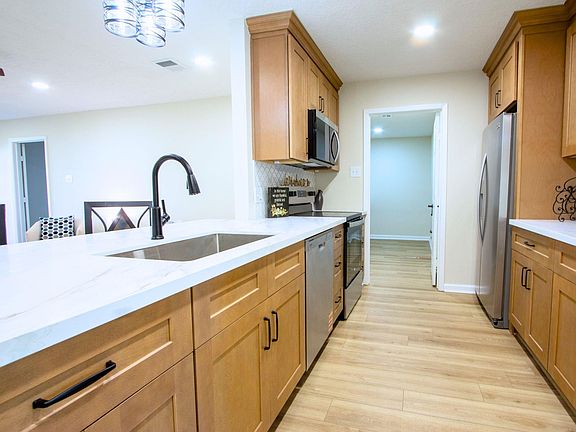 Completely remodeled this 4/2/2 home is turnkey ready! Double pane windows, all new flooring, fixtures, cabinetry, quartz counters, appliances, neutral palette=no work/upgrades for you to do! Plus there’s a newer HVAC & PEX plumbing. Open concept floorplan means family gatherings/ entertaining is easy & convenient. Imagine guests gathered around the breakfast bar, enjoying a fire in the gas fireplace–all while you remain connected w/ the fantastic floorplan. The primary suite offers a spacious ensuite w/ a glass shower, perfect for washing away the cares of the day; there’s also a large walk-in closet. Three additional bedrooms means everyone has space to call their own–or use them for an office, guests or crafts. All bedrooms have large closets to help w/ storage. The hall bath is generously sized & has double sinks for convenience. Close to everything: medical facilities, shopping, restaurants & also a great location for commuting. Grab this one before someone else does!